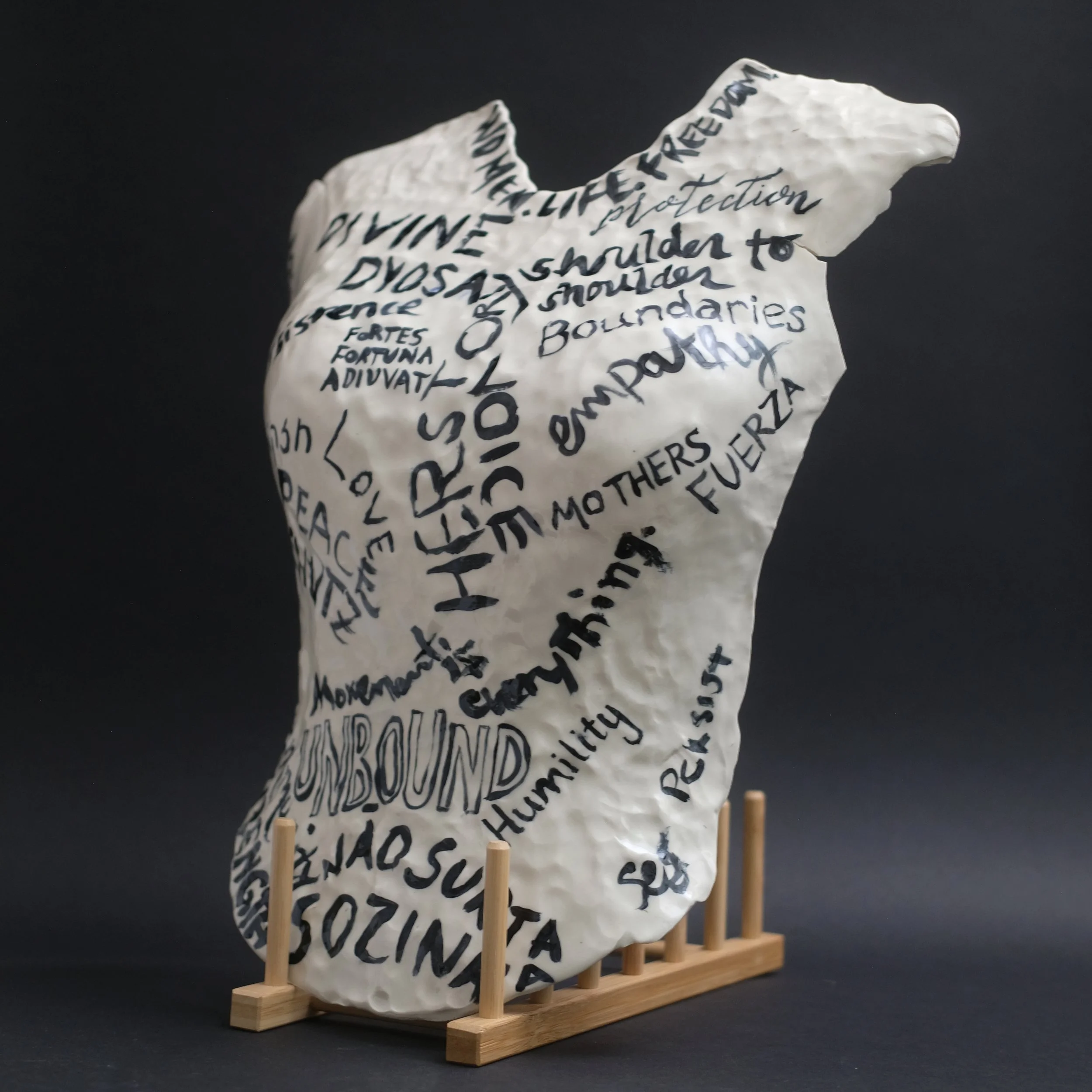 A sculptural collection inspired by the continued fight for women's rights all over the world. Words used in song, in protest, in stories shared and passed down from generations are words of strength and protection for women's rights.